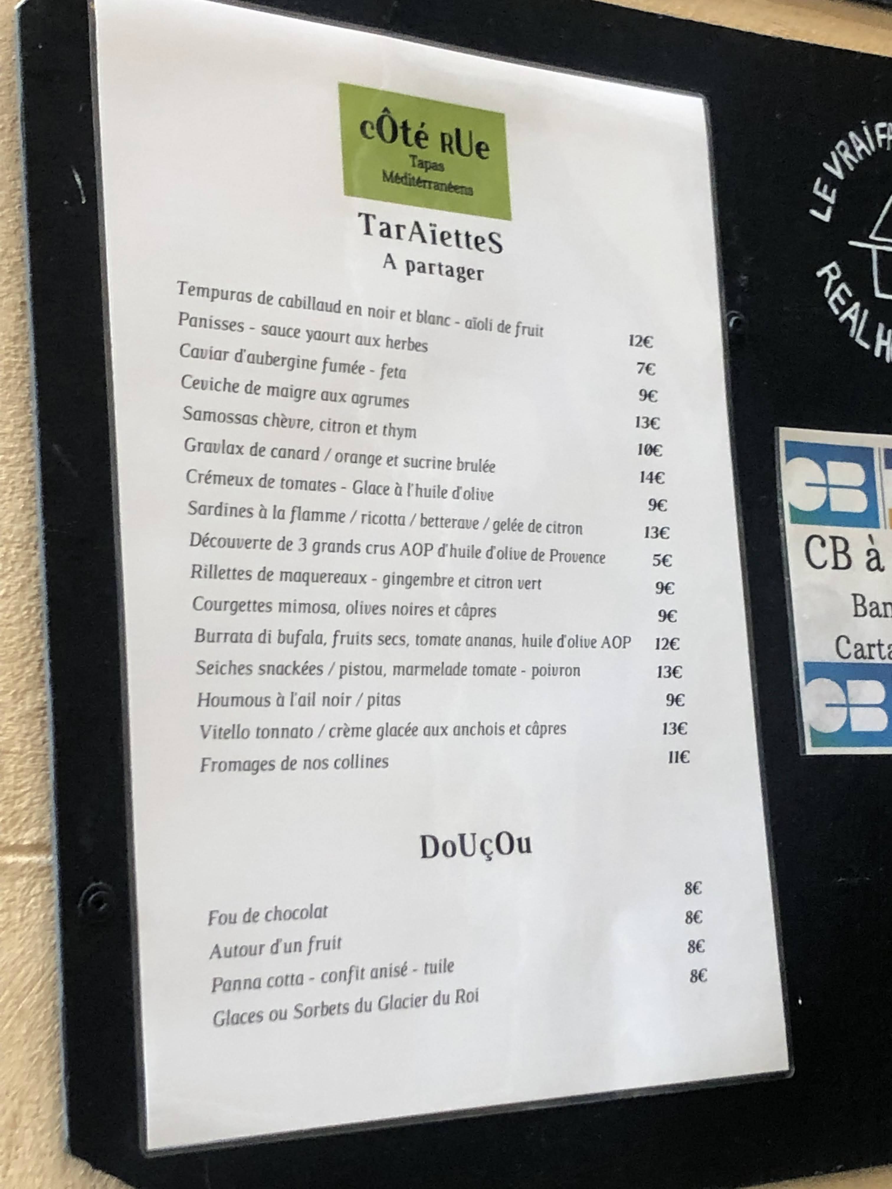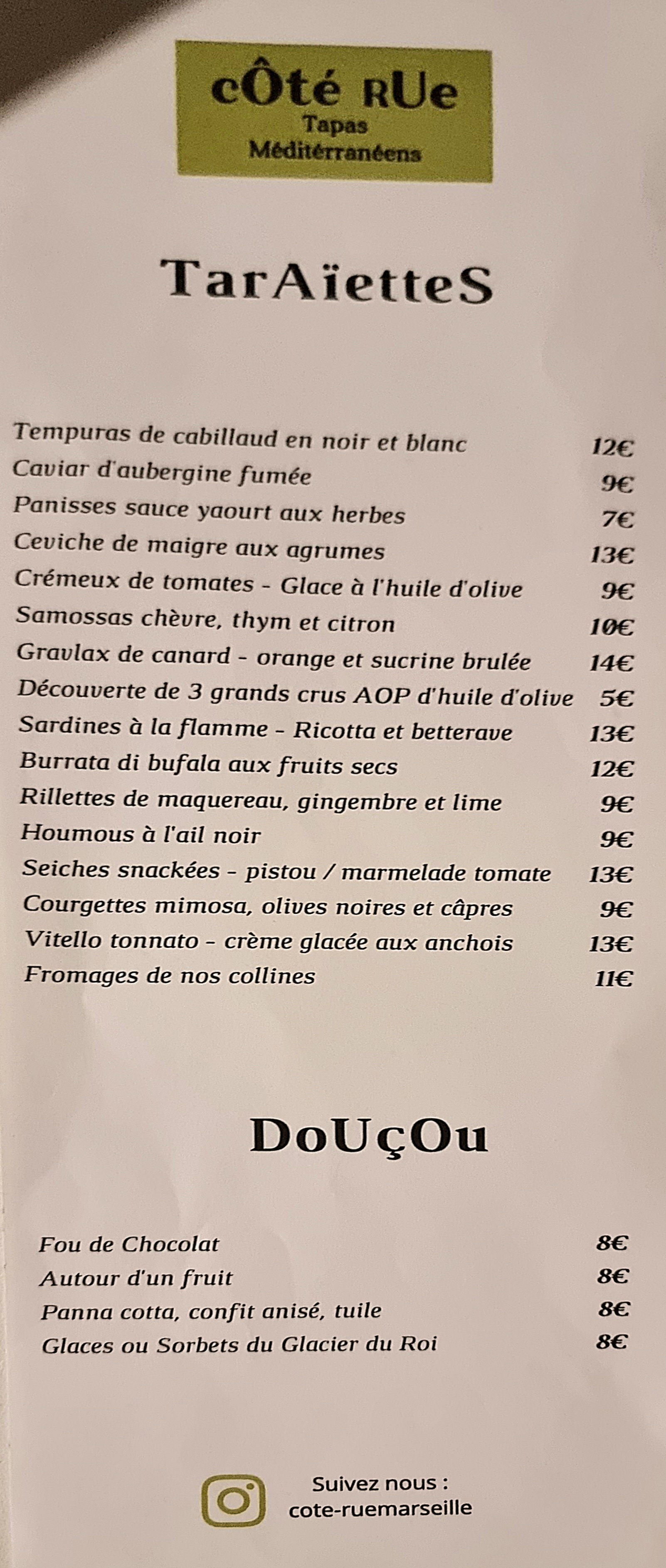 Côté Rue propose des tapas ou apero dînatoire... de quoi se régaler et profiter d'un moment resto en ces temps pas rigolos de couvre feu. Changeons nos habitudes pour un apero repas vraiment sympa et délicieux ! Bravo aux cuisinières innovatrices et si sympathiques ! Merci !