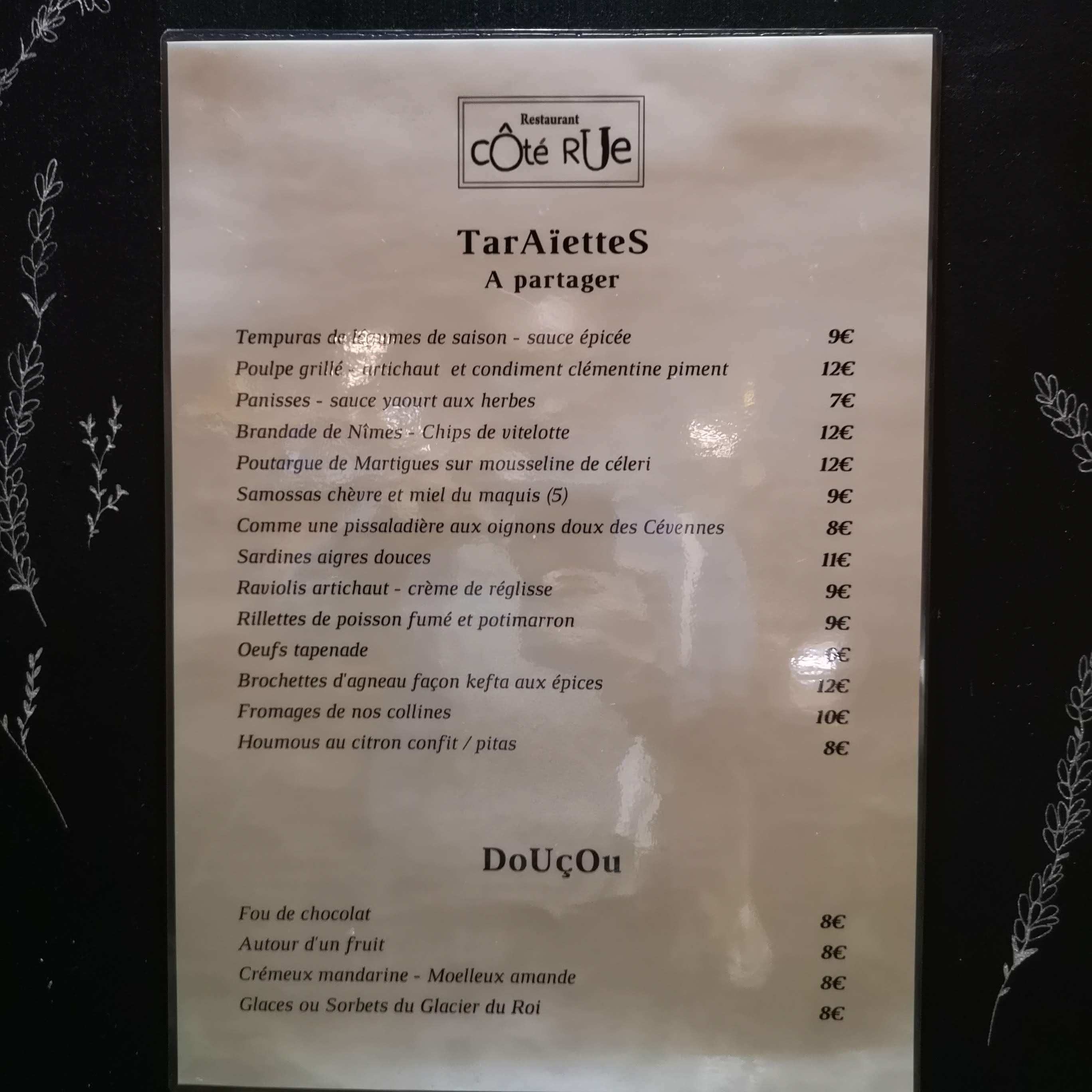 Petit resto à la cuisine familiale et gastronomique délicieuse ! La carte est étudiée : équilibre dans le choix, les produits de saison sont frais, très bien cuisinés. Patronne et serveur très sympas ! Un petit bémol sur la qualité des vins servis au verre : avec cette belle cuisine, honnête et généreuse, on aimerait pouvoir déguster des vins AOP, même pour ceux qui boivent peu ( nous étions 3, mais que 2 à souhaiter 1 verre de vin, 1 blanc et 1 rouge...) , en payant plus bien sûr 😊 Donc, allez Côté Rue ! Réservez avant, et pas trop tard car ce resto plaît beaucoup.