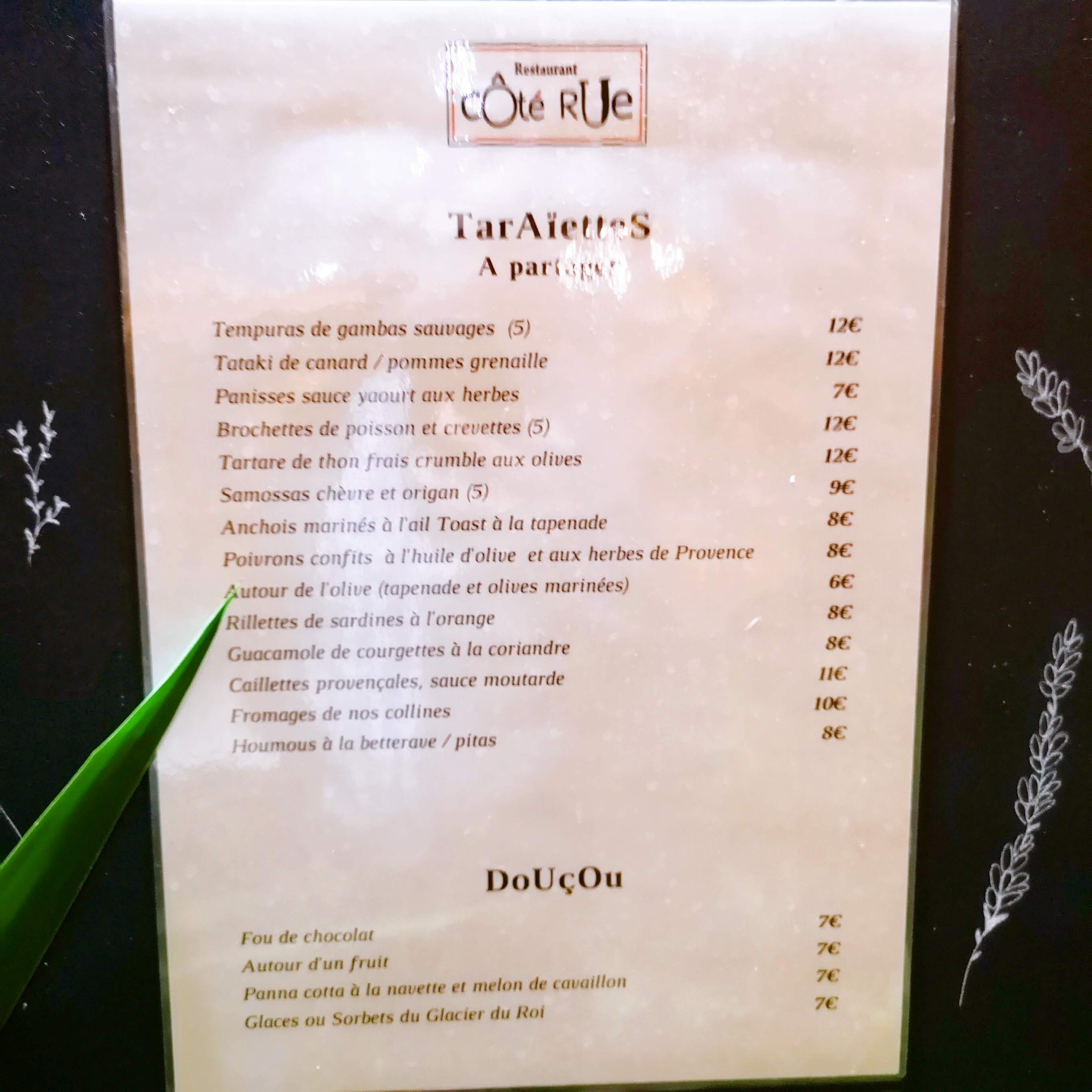 Comme je m'y attendais, la nouvelle carte d'été est divine. Ces tapas provençales faites maison comme d'habitude sont originales et on en sort rassasié. Goûtez le dessert framboise poivron, surprenant de réussite ! Je recommande cette étape gourmande...