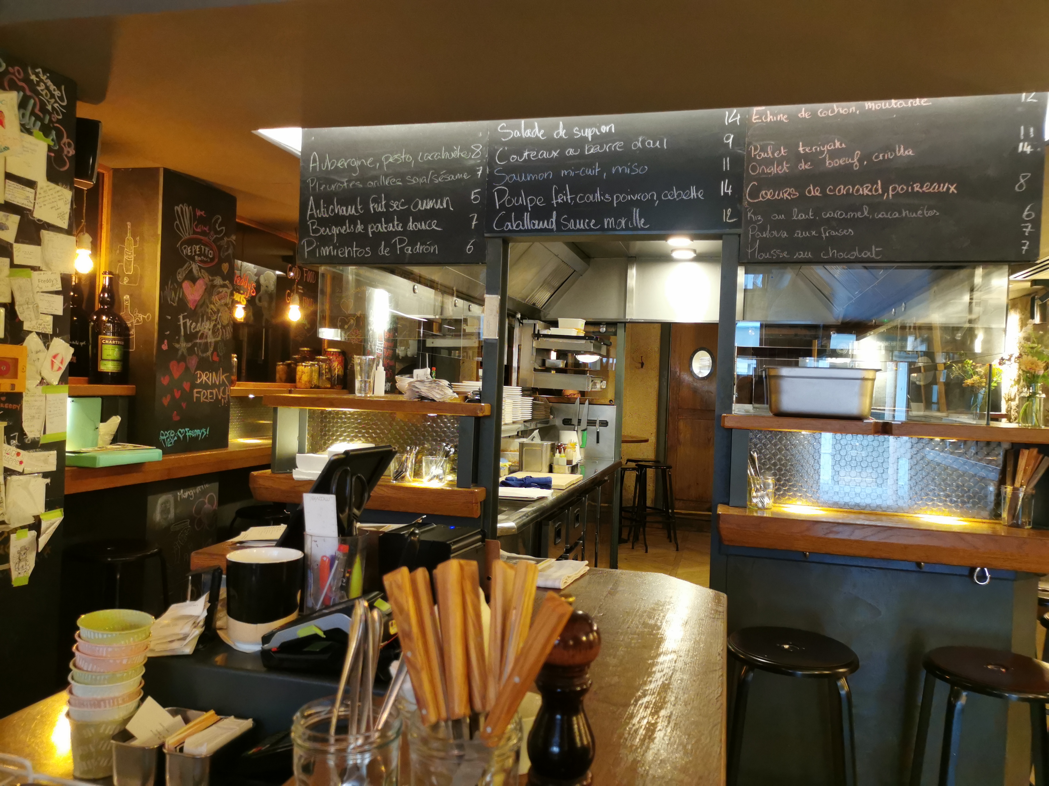 C'est un comptoir à manger ici, et on y mange des tapas. Comme dans tous les lieux de ce type, on n'y va pas pour le calme et l'espace... non on mange autour des grills et du zinc, ça touche un peu les coudes des voisins mais ça donne une ambiance assez sympa. Le service se fait avec le sourire et sans avoir trop à attendre, même si il y a du monde. Les tarifs restent dans la fourchette de ce qui se fait dans le quartier, mais tout de même un peu cher sur certains vins/plats (ce qui en fait me ferait noter 4,5/5 le lieu). Surtout, on y trouve des tapas. Produits frais, suggestions originales, portions assez bien calibrées mais c'est bon et donc on aimerait en avoir plus... C'est même excellent pour certains Tapas, poisson ou viande ! Et d'ailleurs on y va pour ça chez Freddy's, et on n'est pas déçu.