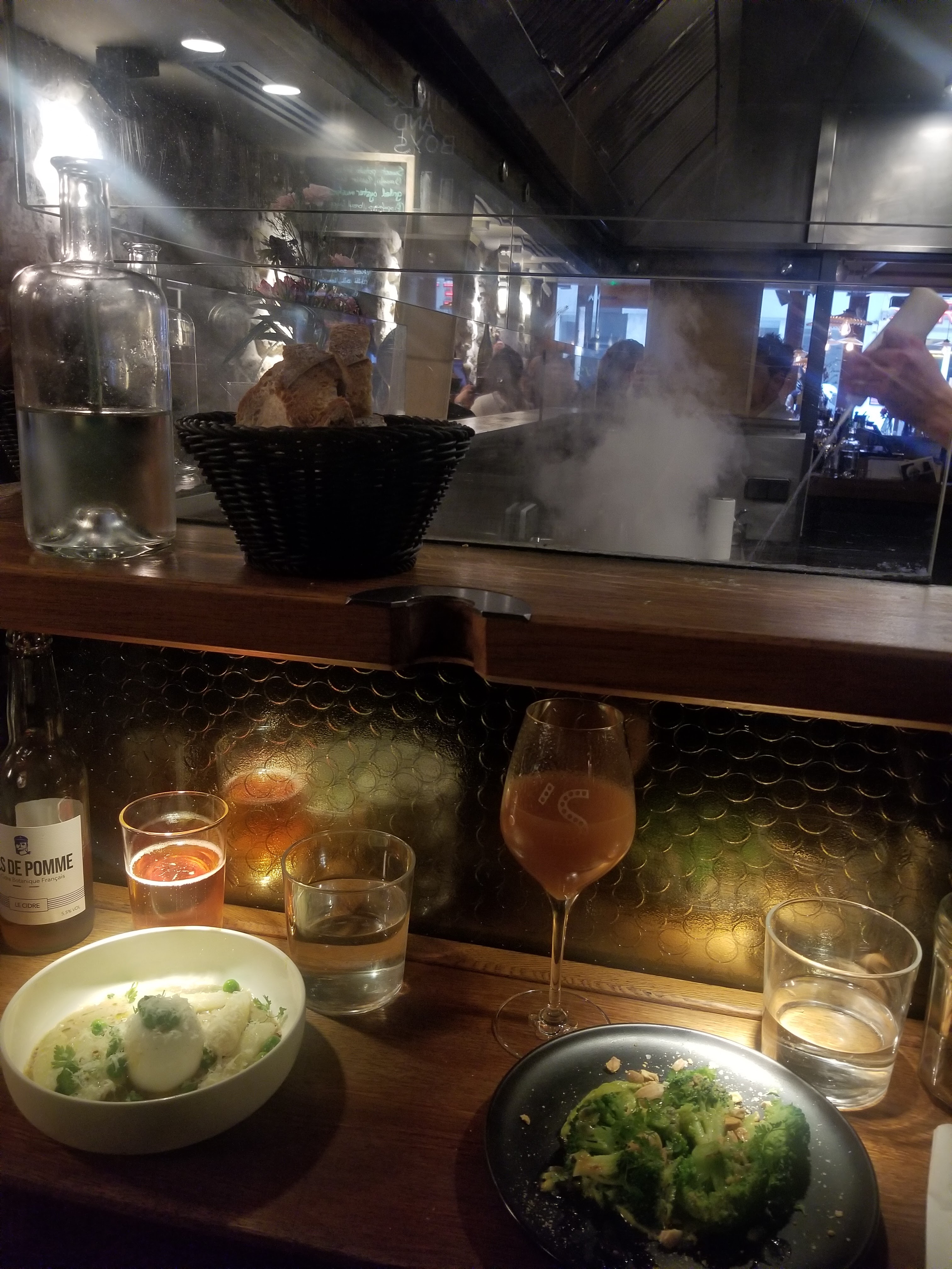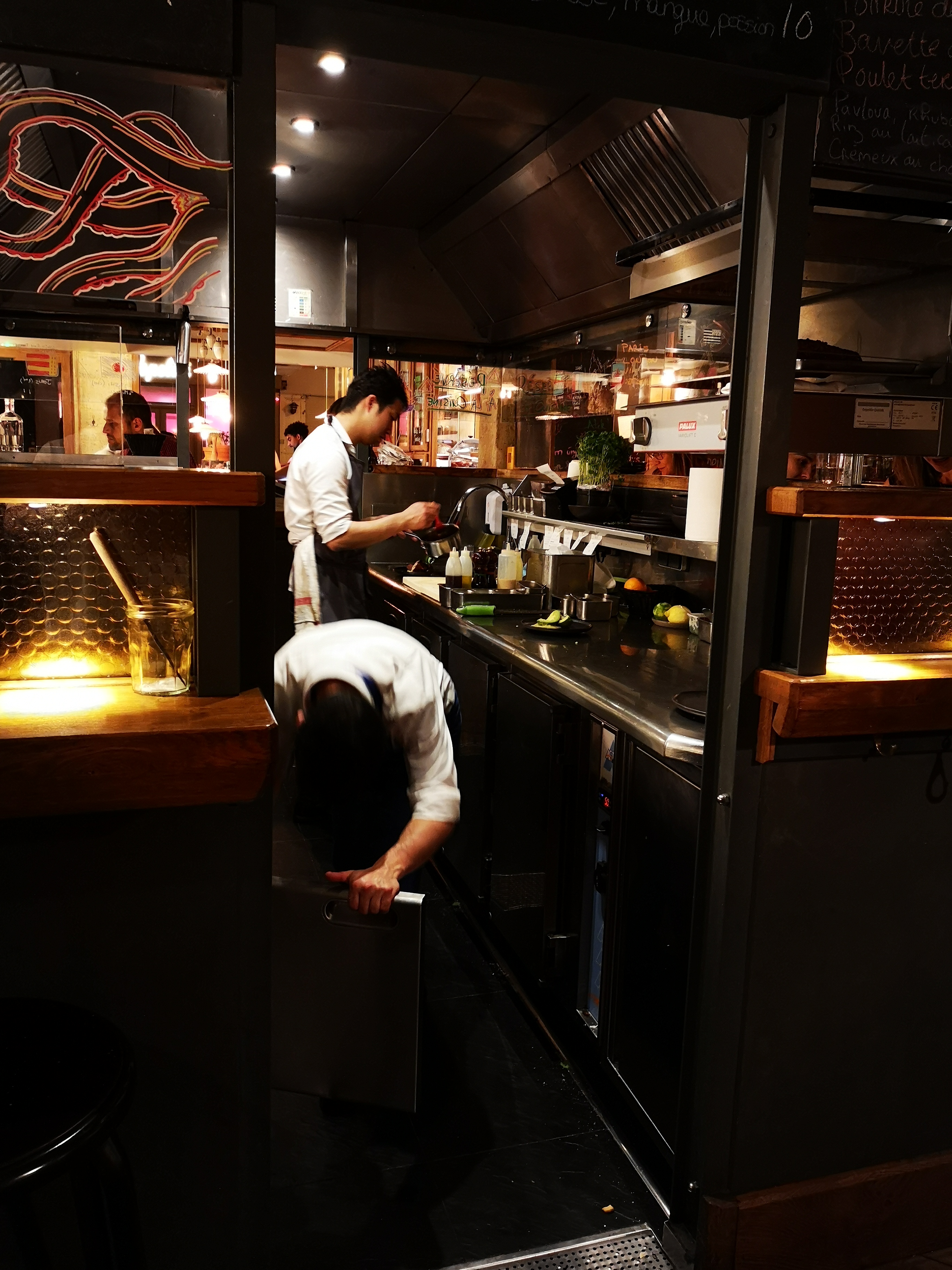 Jolie salle d'où les clients peuvent voir les cuisiniers oeuvrer dans une cuisine impeccable. Concept intéressant de petits plats à partager. Bon accueil, serveur jeune et sympathique.