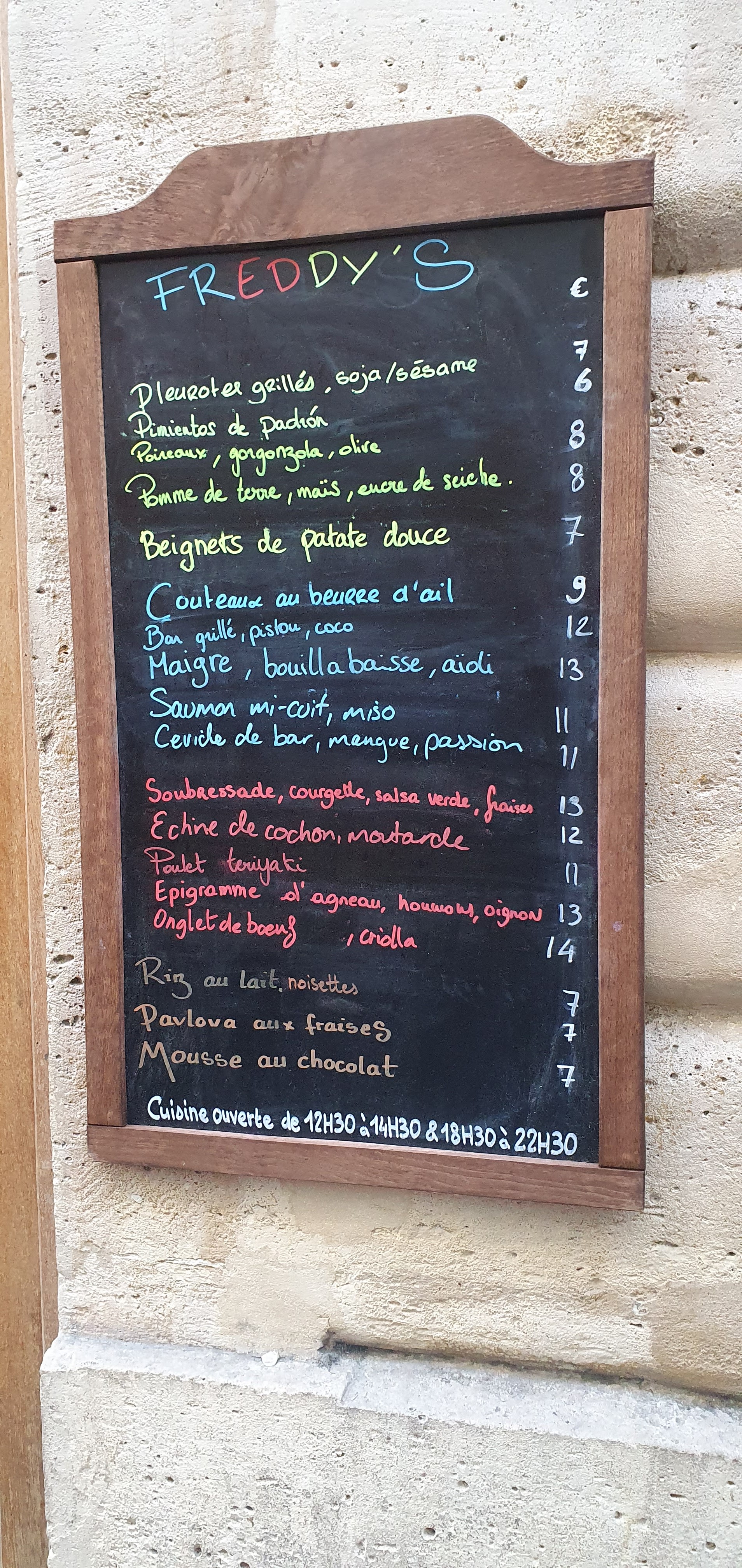 Première visite au Freddy's et très content de cette découverte, c'est vivant joli et très bon. Pas de réservation il faut se munir de patience ou faire un tour en ville, le serveur propose de vous rappeler en cas de table libérée. La cuisine ouverte vous ouvre l'appétit rapidement et les plats types tapas français sont à tomber. En se faisant plaisir verre de vins et plusieurs assiettes compter 30 à 40 euros / personne Ici en photo le magret et bonite tataki Encore merci le Freddy's