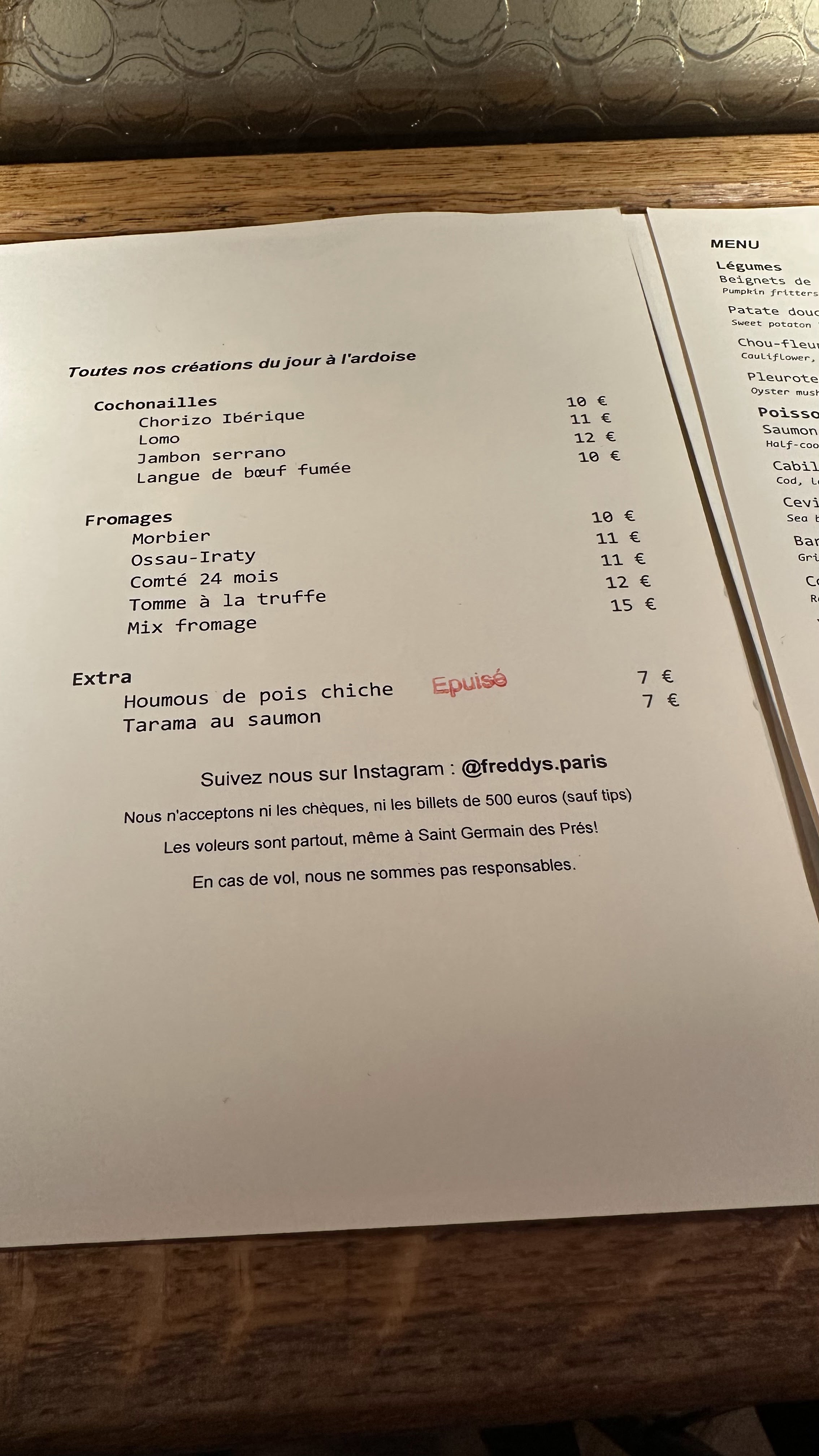 Décevant d’écrire sans réservation sur votre site, Instagram et porte d’entrée et refuser des clients à 22h, dans un resto avec des tables libres, sous prétexte d’une « liste ». Indiquer qu’il y a une liste quelque part, pour que les gens n’aient pas à se déplacer pour rien serait sympa.